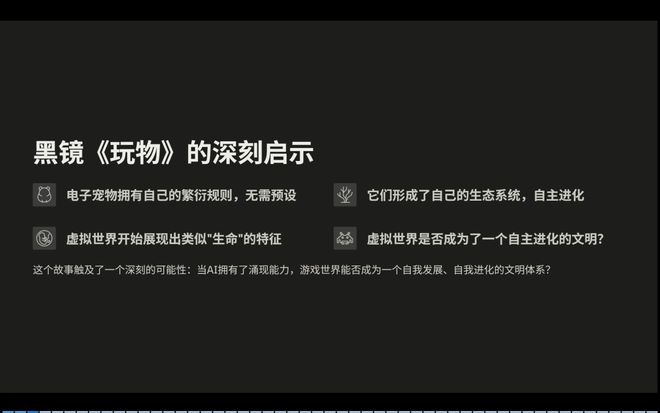 而我们理解的生成式游戏的一个逻辑,是开发者只负责去定义规则,经由AI涌现的系统,最终游戏会发展出自我进化的能力。