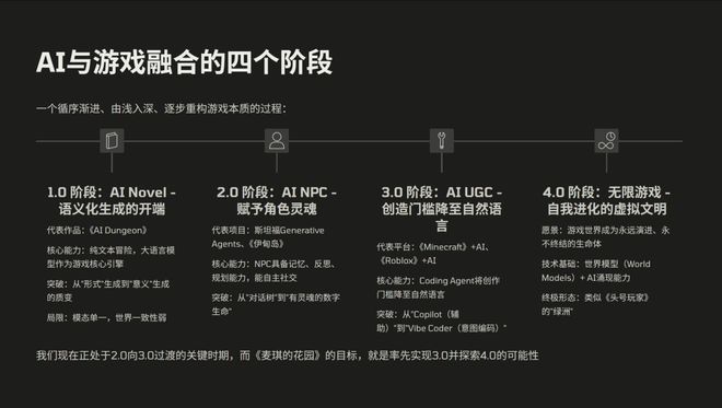 3.0阶段,我们认为是AI UGC时代。在这个阶段当中,Coding Agent 将创作的门槛降低到自然语言,玩家直接能够进行游戏内容的创作。这极大地鼓励了玩家创作,并提升了内容质量,也缩短了制作游戏内容的周期。像《Minecraft》和《Roblox》这样的产品,其实在他们的游戏社区中已经有人率先尝试跟 AI 去结合。