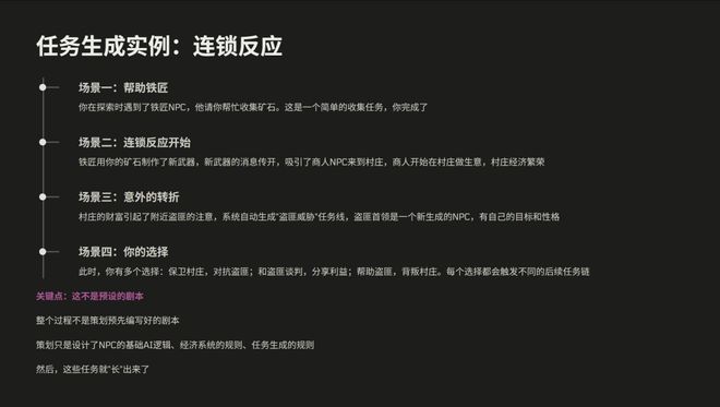 但我们认为,生成式的任务是不一样的。在我们的游戏当中,我们设计了一套任务生成的系统,AI 会实时分析玩家的状态,包括他的资源,他的社会关系,还有他的位置,结合他的目标和世界的当前的状态,动态地生成任务。