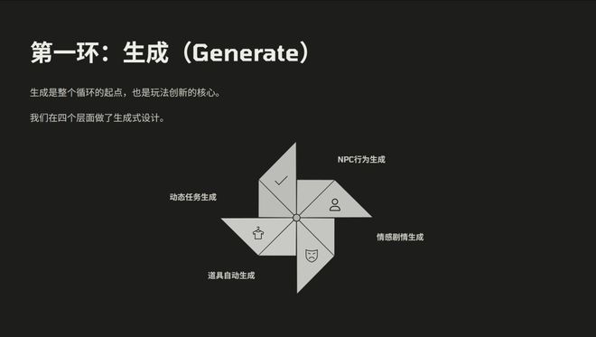 此外,张昊阳分享了从生成、探索、反馈到再生成的核心循环,以及“底座型游戏”和“黄金三角”设计哲学。它们不仅会改变玩家体验,也可能重塑整个游戏产业的生产方式。