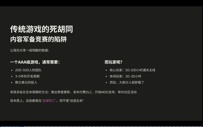 让我先分享一个残酷的数据。一个 3A 游戏通常需要 200~500 人的团队,3~5 年的开发周期和数亿美元的投入,而玩家通常会用 50~100 小时通关主线,休闲的玩家则会更短,然后,大部分人就把游戏卸载了。