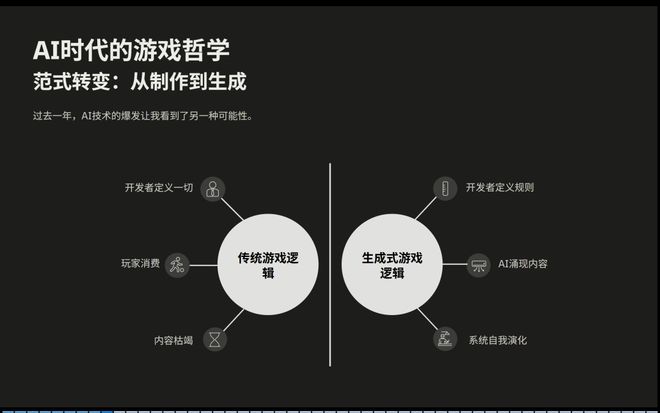 过去两年里, AI 爆发让我们看到另一种可能性,传统游戏逻辑是,开发者决定一切内容给玩家消费,随后这个内容就枯竭了,游戏从而走向死亡。