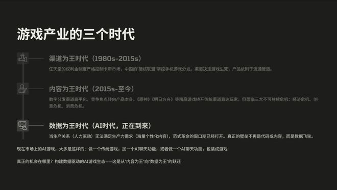 真正的区别在哪里?我认为是构建数据驱动的AI游戏生态,这个是从“内容为王”到“数据为王”的一个跃迁。
