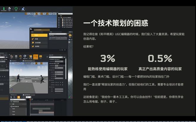 我记得在做《和平精英》的游戏编辑器的时候,我们投入了大量的游戏资源,希望玩家能够利用这些资源去创造内容。结果我们发现,真正能熟练使用编辑器的玩家不到 3%,而真正产出高质量内容的不到 0.5%。