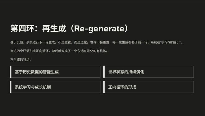 当这四个环节形成正向循环之后,生成的内容会越来越符合玩家偏好,玩家的探索能力会越来越强,反馈也会越来越丰富,生成内容的质量也会越来越高。游戏就会变成一个永远在线、持续发展的系统。