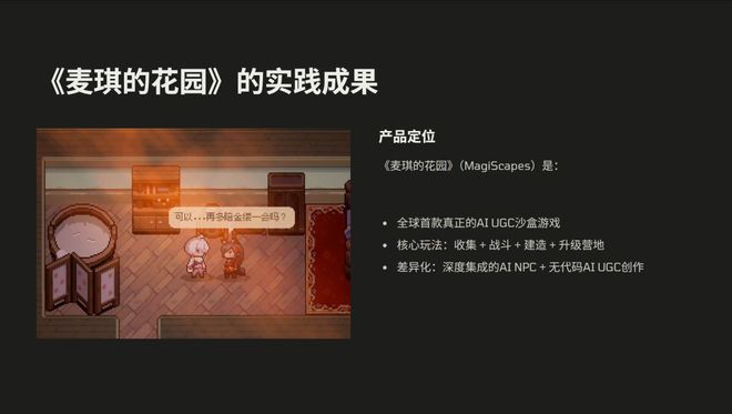 AutoGame开发的游戏《麦琪的花园》,目前在Steam上有一万人添加了愿望单。此前的测试中,有 83% 的玩家认可 AI 陪伴的玩法,玩家平均游玩时长超过传统的沙盒游戏 50%,社区 UGC 内容是他们当时预期的 4 倍左右。
