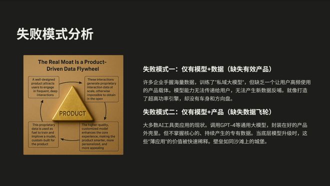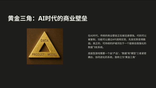 这样的突破性游戏需要产品、数据和模型三者紧密结合,形成一个协同进化的系统,我称之为“黄金三角”。我认为它不仅适用于游戏,对所有 AI 产品也都成立。