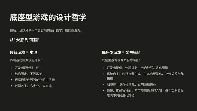 而底座型游戏更像是一个摇篮,开发者提供的是基础的物理规则、初始的种群和进化的方法,系统可以自主生成内容,自主发展生态文化,自主形成社会关系。