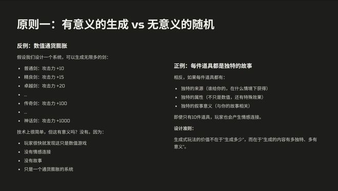 我们有三个原则。第一个是语义驱动生成,第二个是属性要跟叙事相关,第三个是它要产生一个虚拟的经济生态。