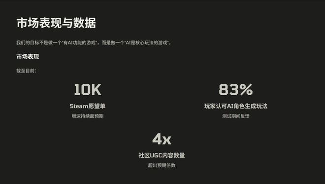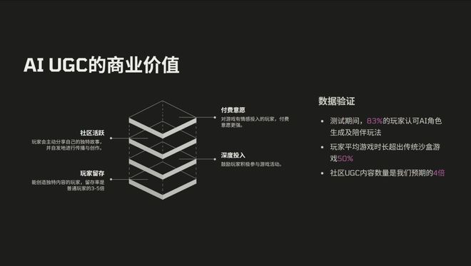 从数据的验证来看,我们有 83% 的玩家认可 AI 陪伴的一些玩法,玩家平均游玩时长超过传统的沙盒游戏 50%,社区 UGC 内容是我们当时预期的 4 倍左右。
