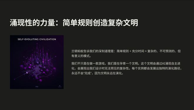 这就像是一场永无止境的军备竞赛。我们不停地做加法,但从未问过一个根本问题:能不能让游戏成为一个自我生长的生命体?能不能通过 AI 涌现,让游戏世界自己进化成一个文明?
