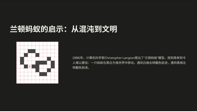 1986 年,科学家兰顿提出了一个极简模型,简单到难以置信。想象一个无限大的黑白格子世界,只有一只蚂蚁在上面移动,它的规则只有两条:如果蚂蚁站在白色格子上,就把格子翻成黑的、右转并前进;如果站在黑色格子上,就翻成白的、左转并前进。不断重复,就这么简单。