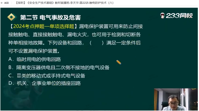 【知识点来源】《安全生产技术基础》教材直播班-李天宇-第22讲-触电防护技术(六)