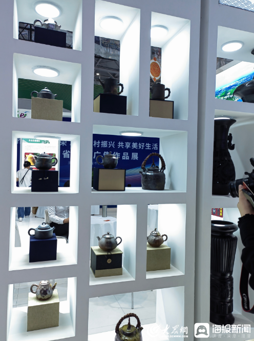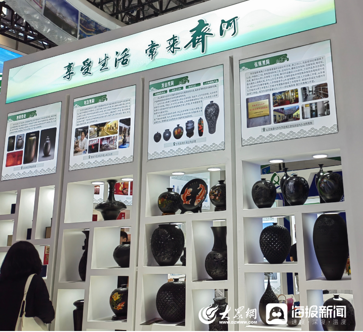 走进陶艺展示区,制作精致、造型优美的齐河黑陶吸引众多观众驻足观看。“黑如漆、明如镜、硬如瓷、声如罄”,齐河黑陶多次作为国礼赠送外宾,对弘扬我国古老文化起到极大的宣传作用。齐河刘浩陶艺、龙山黑陶、张辉黑陶等创作的多件产品被领导人收藏。此外,旭腾柴烧为本县非遗项目,秉承传统古法柴烧烧制方法,原始制作技艺,并适应时代需求,推出手捏柴烧作品、柴烧培训、体验、研学等项目,为古法柴烧的传承与发展做出了巨大贡献。