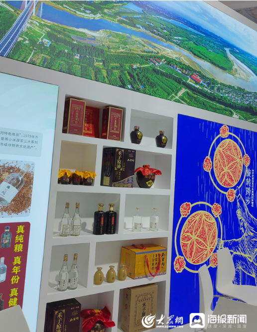 走进特产展示区,映入眼帘的是创于1945年的“玉皇阁”酒厂,是“山东老字号”“山东省著名商标”“齐河特色商品”,沿用中国最传统纯手工“老五甑”古法酿酒工艺,不添加一滴酒精、香精、香料,不经过任何化学勾兑,是典型的纯天然绿色食品,被列为“市级非物质文化遗产”“县级非物质文化遗产”。